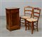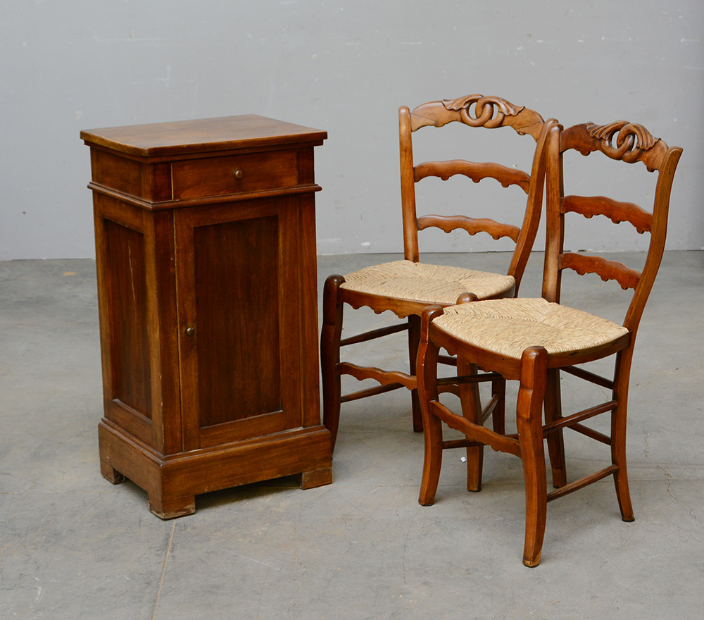 Lotto composto da una coppia di sedie con schienale a giorno intagliato ed un comodino ad un anta ed un cassetto, secolo XIX (difetti)