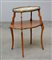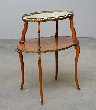 Tavolino servant da centro a due ripiani, uno in marmo bianco venato decorato con ringhierina traforata, l'altro in legno intarsiato a motivi floreali e volute, montanti sagomati decorati da fregi in metallo dorato, Francia inizio del secolo XX (cm 88x100x53)(difetti)