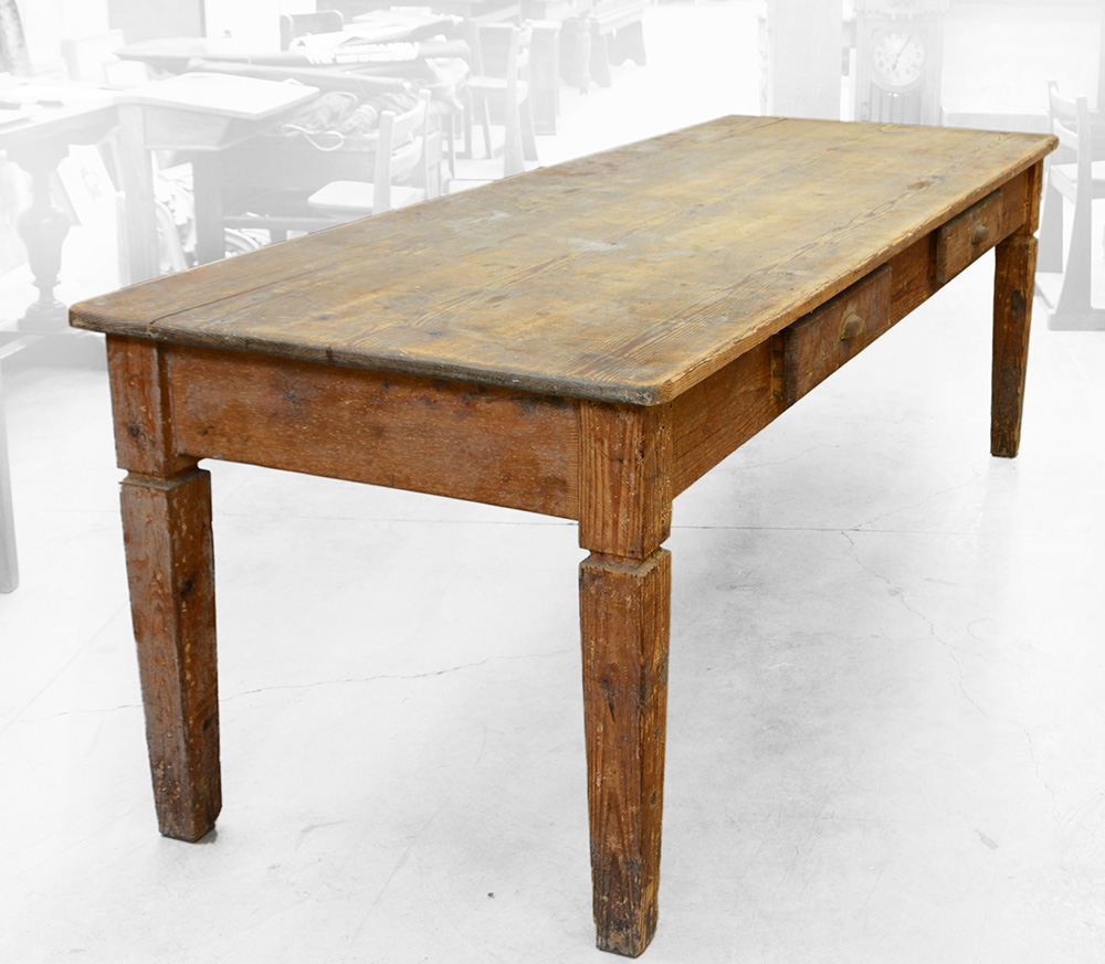 Tavolo rettangolare rustico in legno dolce a quattro cassetti, gambe rastremate, secolo XIX (cm 242x82x89)(difetti)