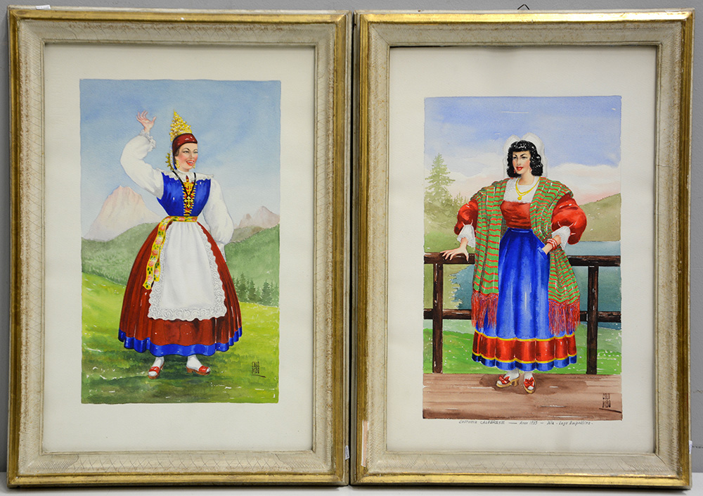 Gruppo di quattro acquarelli raffiguranti figure in costumi popolari (cm 50x33) firmate Colombo, in cornici (difetti)