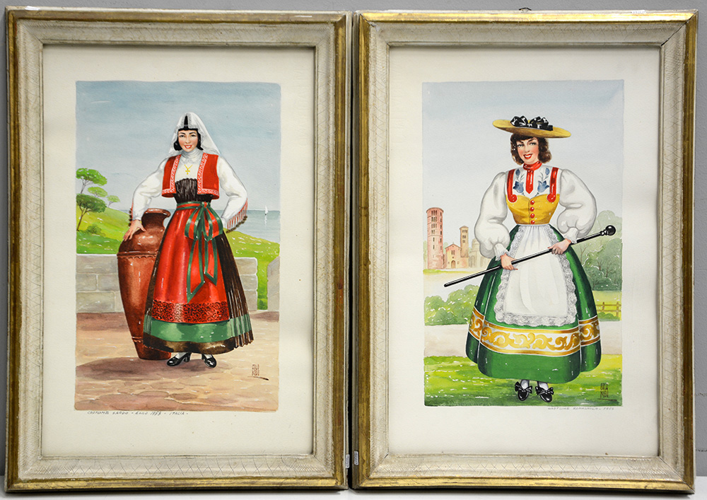 Gruppo di quattro acquarelli raffiguranti figure in costumi popolari (cm...
