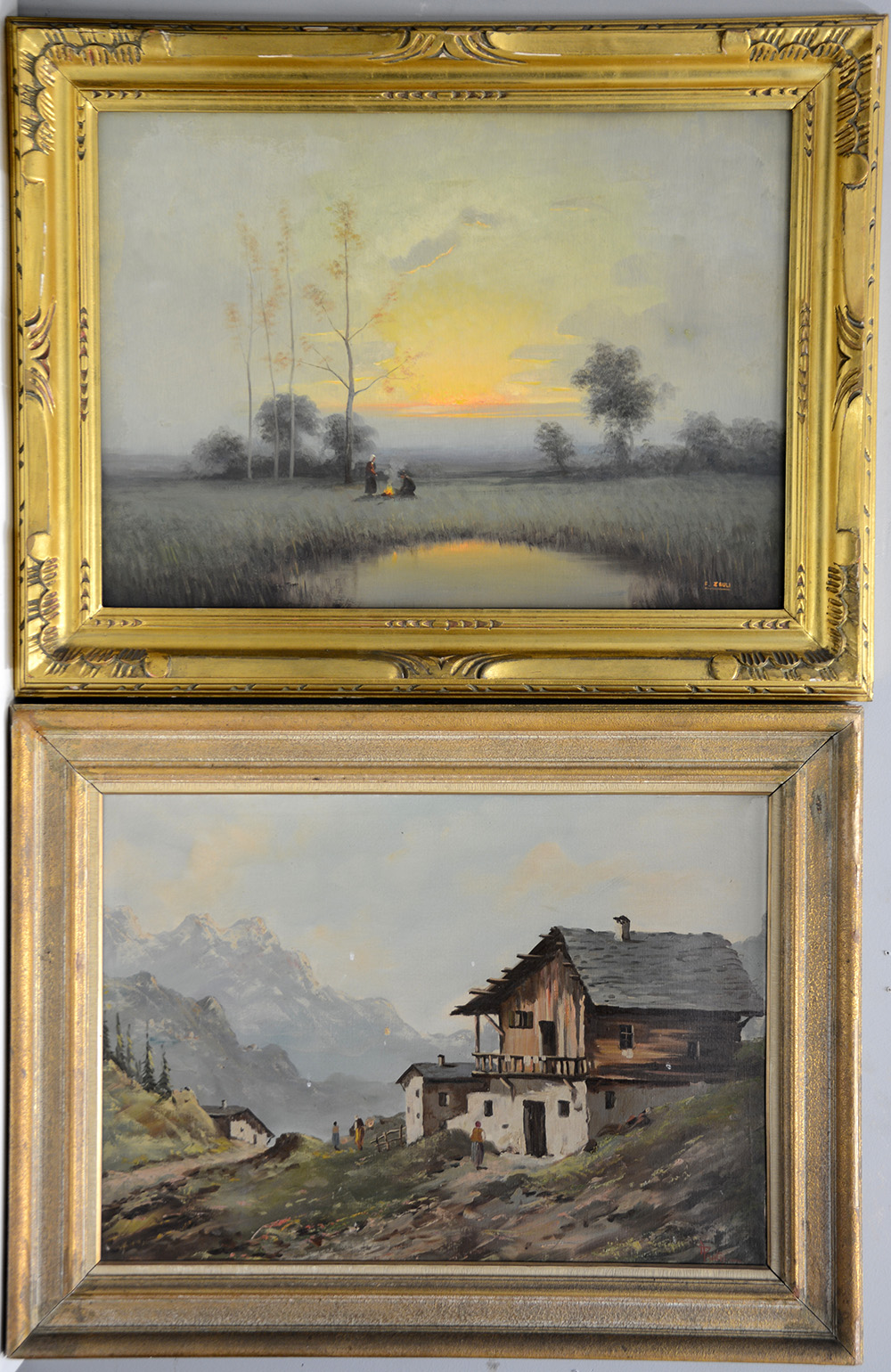 Lotto di due dipinti ad olio raffiguranti paesaggi. Autori e misure diverse, in cornici (difetti)