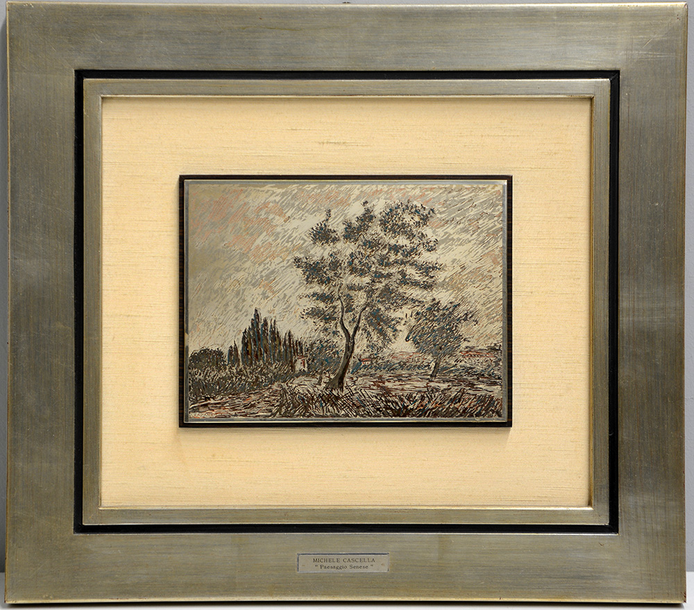 "Paesaggio senese" multiplo su lamina d'argento (cm 18x24) esemplare numero 832/999, certificato di garanzia al retro, in cornice