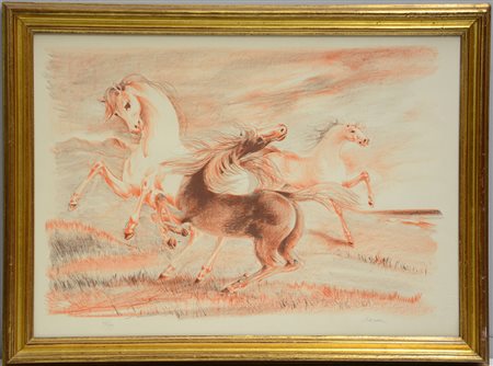 "Cavalli" litografia (50x70) firmata e numerata 98/99, timbro a secco, al retro timbri della Galleria d'Arte Crisciano, in cornice