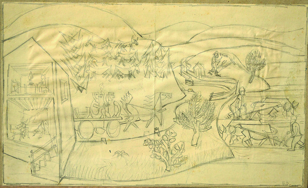Fortunato Depero Serrada allegoria alpestre matita su carta incollata su supporto di carta marrone 18,2x 30 del 1925 archivio catalogo generale n FD 4313-DIS