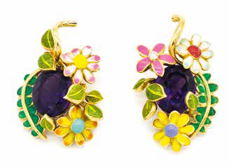 ORECCHINI in oro giallo con ametiste e smalti, gr. 17