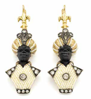 ORECCHINI MORETTI in oro giallo con brillanti e microperle, gr. 19,3