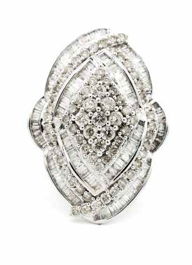ANELLO in oro bianco con diamanti taglio baguette e brillante del peso complessivo di ct. 4,80, gr. 11,8