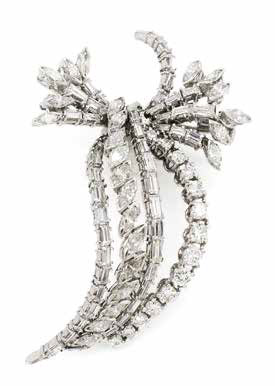 SPILLA in oro bianco con diamanti taglio brillante, navette e taper del peso complessivo di ct. 4,50 circa, gr. 22,7