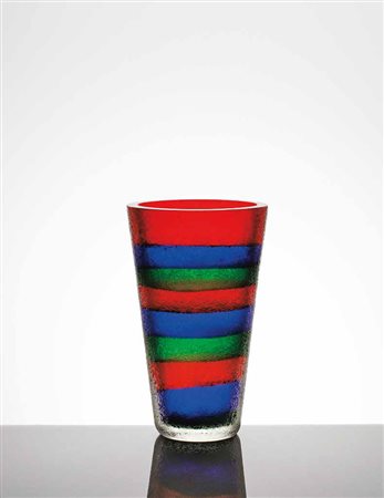 I.V.R. MAZZEGA Vaso in vetro pesante con superficie corrosa con decoro a fasce policrome, anni ‘60. altezza: cm 32,6