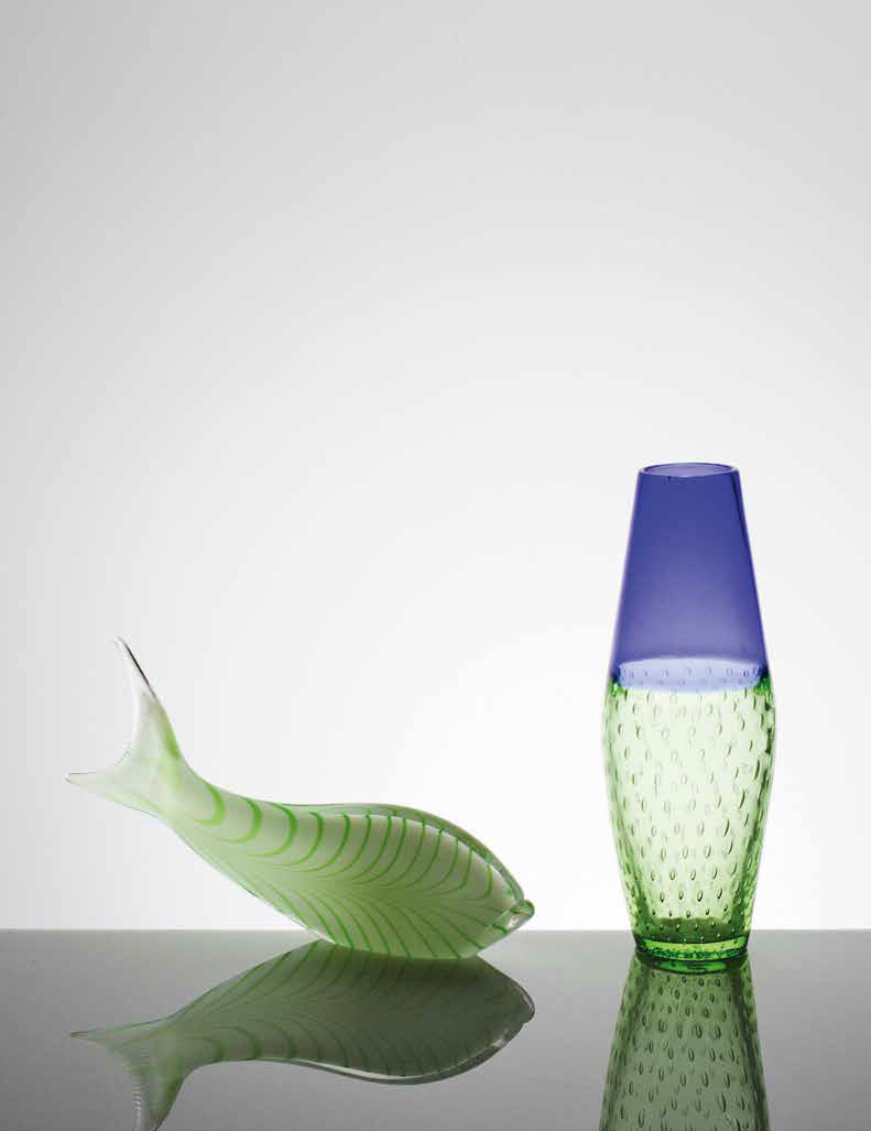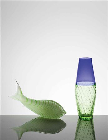 MANIFATTURA MURANESE Pesce in vetro lattimo con decorazioni a fasce nei toni del verde. lunghezza: cm 34
