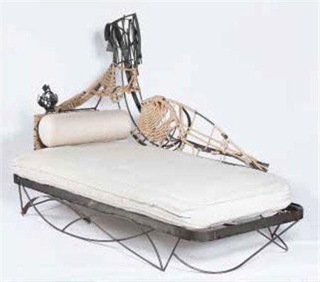 RENATO BASSOLI (1915-1982) Chaise – longue in metallo patinato e corde, 1950 circa dimensioni: cm 132x190x93. Pezzo unico. Esposizioni: Monaco, Museo Villa Stuck, Die Fünfziger: Stilkonturen einesJahrzehnts. Italien, Skandinavien, Frankreich, Deutschland, USA, Polen, England, Niederlande, 13 gennaio – 26 febbraio 1984. Bibliografia: AA. VV., Die Fünfziger: Stilkonturen eines Jahrzehnts. Italien, Skandinavien, Frankreich, Deutschland, USA, Polen, England, Niederlande, Monaco, 1984, pag. 104, n. 173 (ill.)