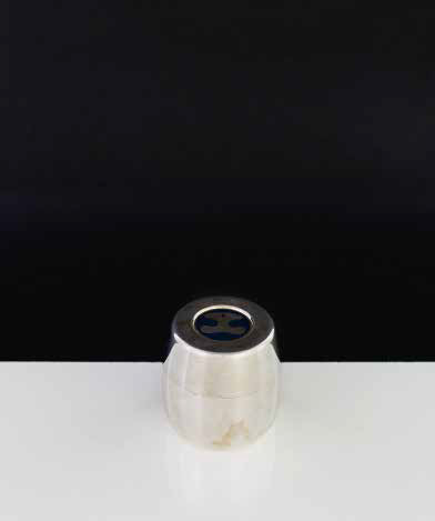 HENNING KOPPEL (1918-1981) LABORATORIO GEORG JENSEN Contenitore da tè in argento e smalto azzurro, 1968 circa Punzoni: DESSIN / HK / DENMARK STERLING / GEORG JENSEN. Dedicato all’interno: 1943 - 1968 RADGIVENDE INGENIORGIRMA JOHS JORGENSEN A/S. altezza: cm 8