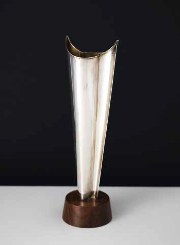 TAPIO WIRKKALA (1915-1985) KULTAKESKUS OY Vaso “Liekki” in argento 925 su basamento in legno, modello “TW228”. Punzone: leone (simbolo Kultakeskus) / corona / 925 / 07A. Siglato: TW. altezza: cm 30,5