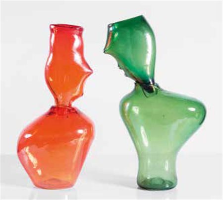 ANDRÉ VERDET (1913-2004) FUCINA DEGLI ANGELI Due figure componibili in vetro verde e rosso. Firma incisa: 1/3 A. Verdet/ Fucina Angeli Venezia 62 G. Nason. altezze: cm 63,5; cm 66. Esposizioni: Venezia, Fucina degli Angeli, 1970; Monaco, Museo Villa Stuck, Die Fünfziger: Stilkonturen eines Jahrzehnts. Italien, Skandinavien, Frankreich, Deutschland, USA, Polen, England, Niederlande, 13 gennaio – 26 febbraio 1984. Bibliografia: AA. VV., Fucina degli Angeli, catalogo della mostra, Venezia 1970, riprodotto; AA. VV., Die Fünfziger: Stilkonturen eines Jahrzehnts. Italien, Skandinavien, Frankreich, Deutschland, USA, Polen, England, Niederlande, catalogo della mostra, Monaco, 1984, pag. 52, n. 22, riprodotto