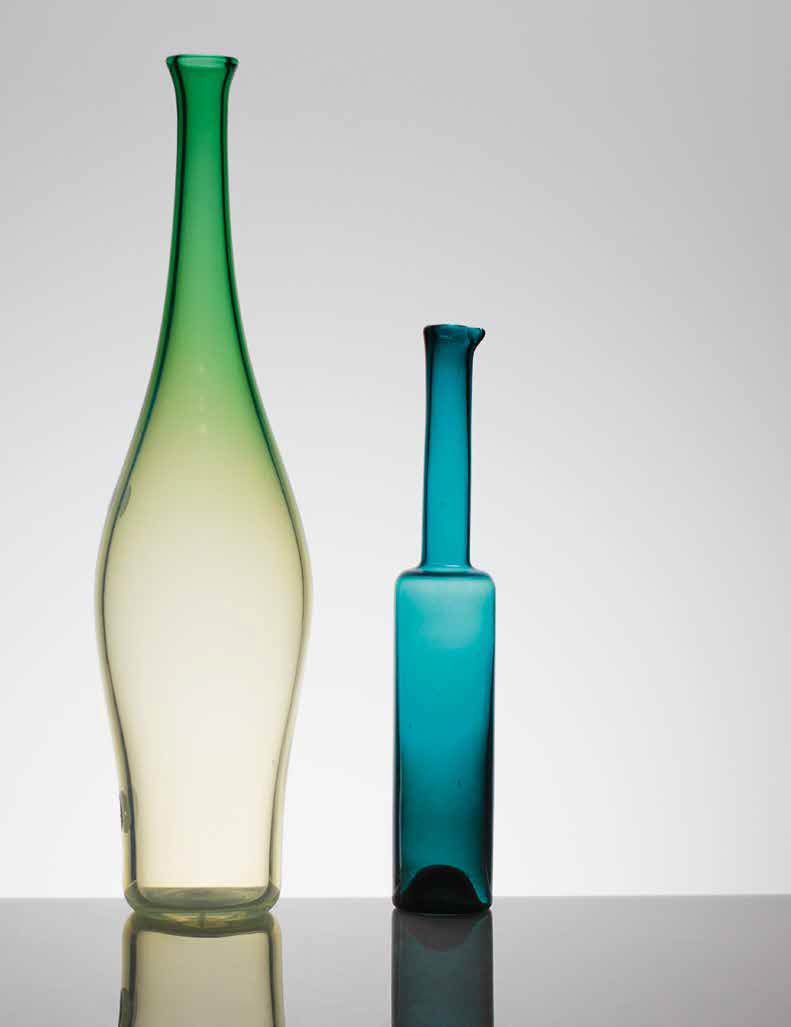 NANNY STILL MC KINNEY (1926 - 2009) RIIHIMÄEN LASI OY Bottiglia in vetro azzurro. Firma incisa: NANNY STILL Riihimäen Lasi Oy. altezza: cm 34,5