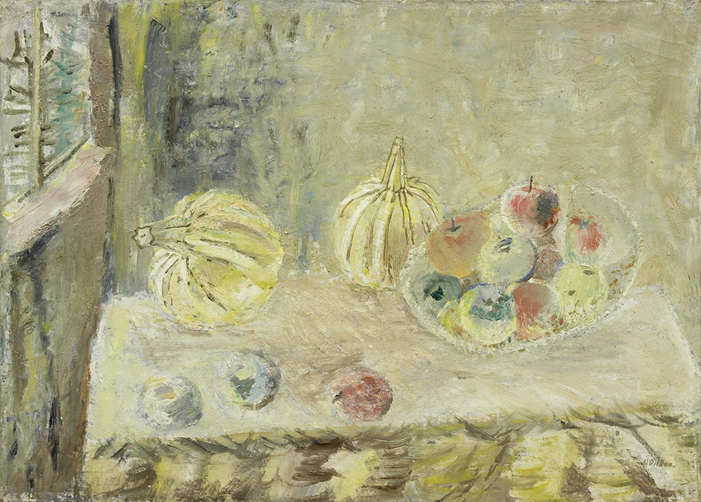 Angelo Del Bon, Milano 1898 - Desio (MB) 1952, Zucche e mele, 1941, Olio su tela, cm 50,5x70,2, Firma in basso a destra: A Del Bon, titolo al verso sulla tela: Zucche e mele: etichetta con n 4025 e timbro con n 1612/229 Galleria dell'Annunciata, Milano; sul telaio: etichetta Opera esposta / alla / I Mostra Nazionale di Pittura / "L'arte e il convito" / Milano - Palazzo della Permanente / 1957: etichetta Galleria dell'Annunciata, Milano, con n 1612/229: timbro Collezione Walter Fontana, Storia: Galleria Annunciata, Milano; Collezione W Fontana, Veduggio; Collezione privata, Bibliografia: Massimo Carrà, Giuseppe Marchiori, Del Bon, tutte le opere, volume secondo 1938-1944, Giulio Bolaffi Editore, Torino 1978, pp 277, 409, n 41/25 (con titolo «Meloni e mele»)