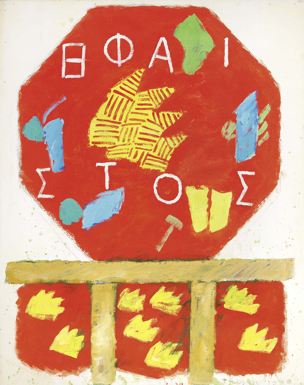 Joe Tilson, Londra 1928, Hephaistos, 1988, Tecnica mista su cartoncino applicato su tavola, cm 103x80,6, Firma e data in basso a destra: Tilson 1988 Al verso sulla tavola: scritta "Hephaistos" 1988 / Inghilterra: due timbri Galleria d'Arte Marchese, Prato, Foto autenticata dall'artista in data 1989