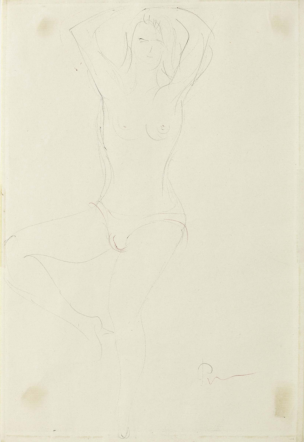 Lucio Fontana, Rosario Santa Fè 1899 - Varese 1968, Nudo femminile, 1958-60, Penna a sfera nera e rossa su carta, cm 33x22, Firma in basso a destra: Fon, Storia: Collezione Teresita Rasini Fontana, Milano; Collezione privata, Milano; Collezione privata, Opera registrata presso la Fondazione Lucio Fontana, Milano, al n 1601/2, Bibliografia: Luca Massimo Barbero, Lucio Fontana Catalogo ragionato delle opere su carta, con la collaborazione di Nini Ardemagni Laurini e Silvia Ardemagni, Skira, Ginevra-Milano, 2013, tomo II, p 724, n 58-60 DF 67