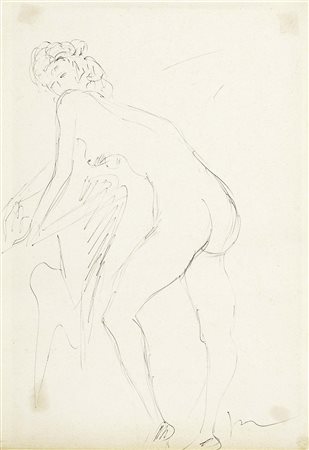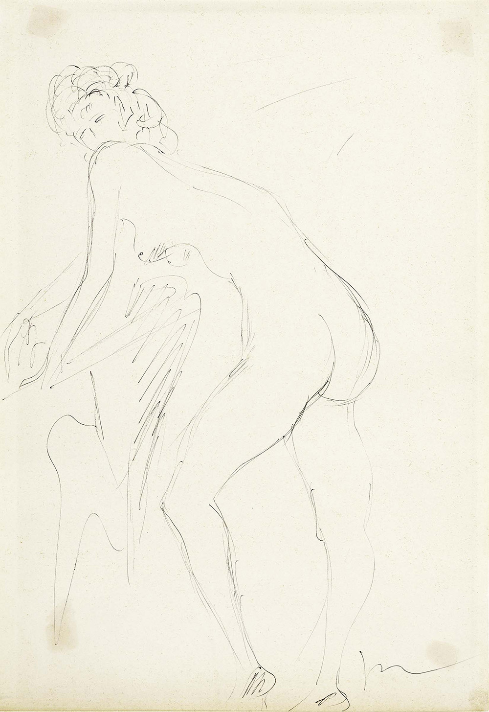 Lucio Fontana, Rosario Santa Fè 1899 - Varese 1968, Nudo femminile, 1958-60, Penna a sfera nera su carta, cm 32,2x22,2, Firma in basso a destra: Fon, Storia: Collezione Teresita Rasini Fontana, Milano; Collezione privata, Milano; Collezione privata, Opera registrata presso la Fondazione Lucio Fontana, Milano, al n 1601/3, Bibliografia: Luca Massimo Barbero, Lucio Fontana Catalogo ragionato delle opere su carta, con la collaborazione di Nini Ardemagni Laurini e Silvia Ardemagni, Skira, Ginevra-Milano, 2013, tomo II, p 720, n 58-60 DF 42