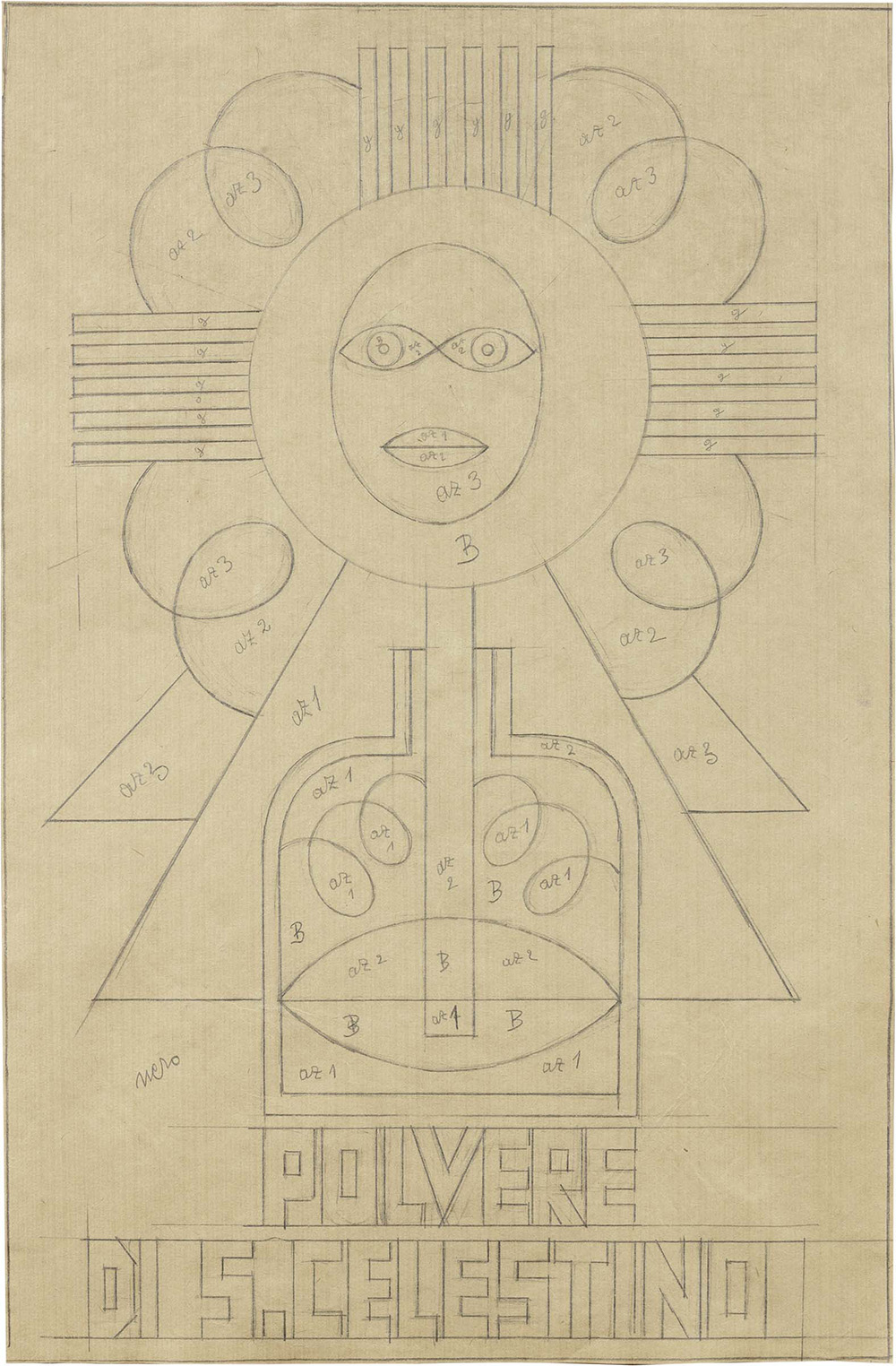 Fortunato Depero, Fondo, Val di Non (Tn) 1892 - Rovereto (Tn) 1960, Polvere di S Celestino, 1921-22, Matita su carta, cm 58x38, Al verso, su un cartone di supporto: etichetta Contini Galleria d'Arte, con dati dell'opera, Storia: Collezione privata, Milano; Collezione privata, Certificato con foto Archivio Unico per il Catalogo delle Opere Futuriste di Fortunato Depero, Rovereto, 24 novembre 2017, con n FD-4270-DIS, Esposizioni: Depero La progettualità Disegni 1920 - 1928, a cura di Maurizio Scudiero, Cortina d'Ampezzo, Galleria d'Arte Contini, 22 dicembre 2017 - 2 aprile 2018, cat p 21, illustrata