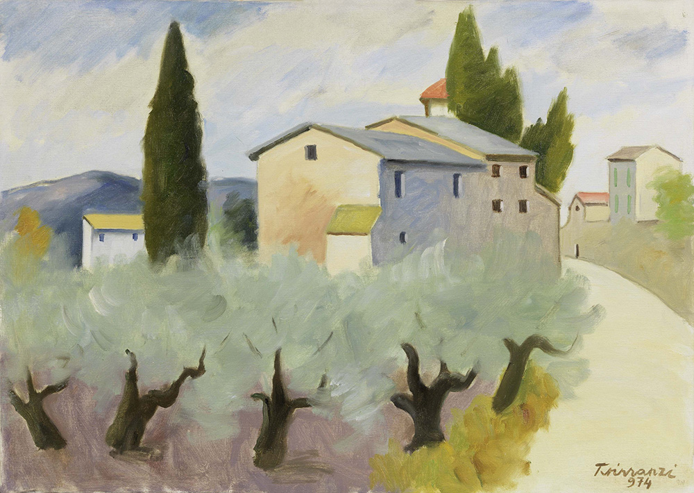 Nino Tirinnanzi, Greve in Chianti (Fi) 1923 - Firenze 2003, Casolari, 1974, Olio su tela, cm 49,5x70, Firma e data in basso a destra: Tirinnanzi / 974