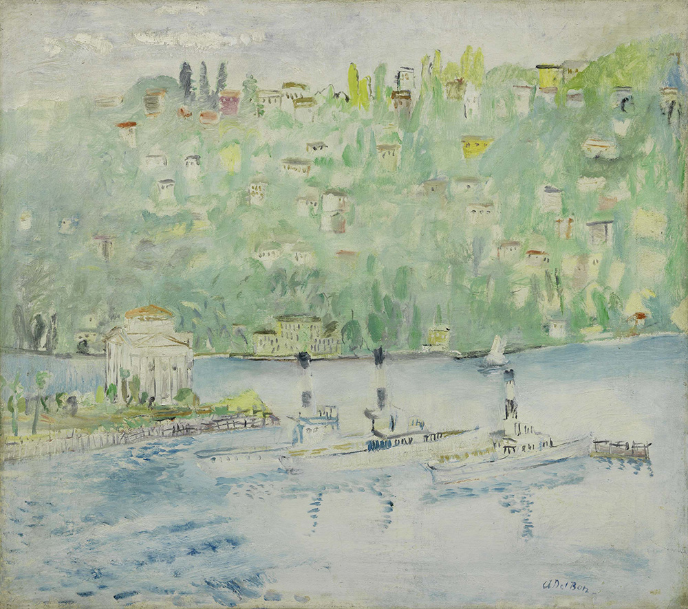 Angelo Del Bon, Milano 1898 - Desio (MB) 1952, Lago di Como (Imbarcadero a Como), 1933, Olio su tela, cm 74x84, Firma in basso a destra: A Del Bon; titolo e data al verso sul telaio: Imbarcadero a Como 1933: etichetta Società per le Belle Arti ed Esposizione Permanente / Mostra di Pittori e Scultori / che recitano a soggetto / marzo - maggio 1971; sulla tela: etichetta Associazione Piemonte Artistico e Culturale / Mostra retrospettiva di / Angelo Del Bon (18/2 - 2/3 1961), cat n 8: etichetta Galleria dell'Annunciata, Milano: etichetta Il Paesaggio nella Pittura / Italiana Contemporanea / 24 settembre - 10 ottobre 1961 / n 24 e tav 20 catalogo, Storia: Galleria Annunciata, Milano; Collezione Fontana, Veduggio: Collezione privata, Bibliografia: Massimo Carrà, Giuseppe Marchiori, Del Bon, tutte le opere, volume primo 1920-1937, Giulio Bolaffi Editore, Torino 1978, pp 53, 154, n 34/4, (opera datata 1934)