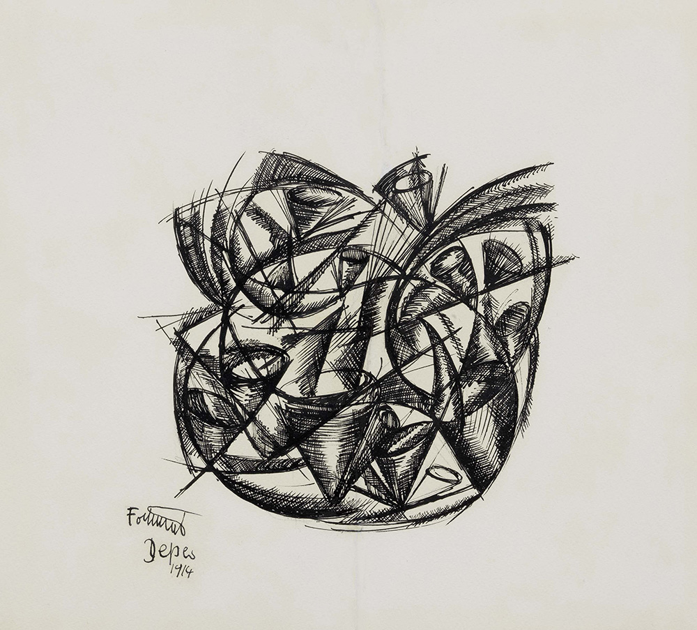 Fortunato Depero, Fondo, Val di Non (Tn) 1892 - Rovereto (Tn) 1960, Trottole giroplastiche, 1914, Inchiostro su cartoncino, cm 34,5x38, Firma e data in basso a sinistra: Fortunato / Depero / 1914, Dichiarazione di pre-archiviazione Archivio Unico per il Catalogo delle Opere Futuriste di Fortunato Depero, Rovereto, 22 novembre 2017