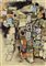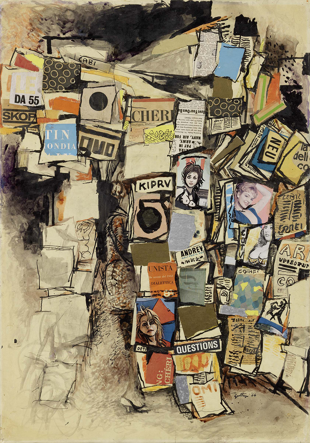 Renato Guttuso, Bagheria (Pa) 1912 - Roma 1987, Edicola, 1964, Collage e tecnica mista su carta applicata su tela, cm 70,2x50, Firma e data in basso a destra: Guttuso '64 Al verso: etichetta Guttuso / Città di Arona, Villa Ponti, Storia: Collezione Marcobi; Collezione privata