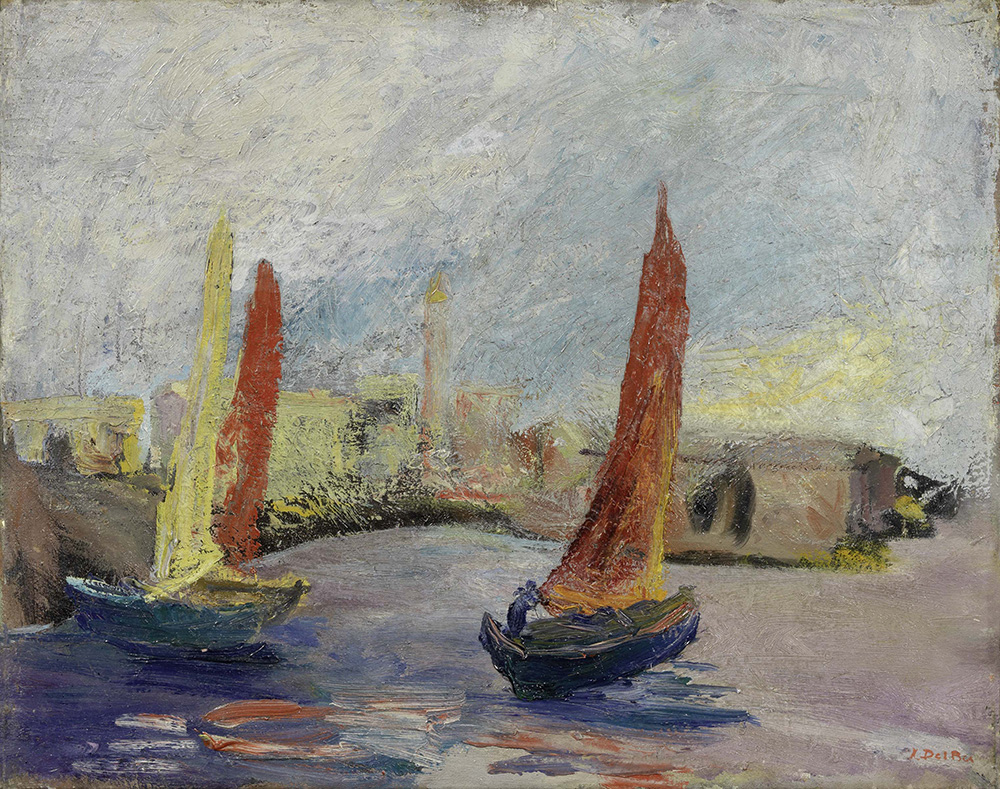 Angelo Del Bon, Milano 1898 - Desio (MB) 1952, Vele veneziane, 1925, Olio su tela, cm 40x50,3, Firma in basso a destra: A Del Bon Al verso sulla tela: etichetta con n 7660 e timbro Galleria Annunciata, Milano, Storia: Collezione privata, Milano; Collezione privata, Bibliografia: Massimo Carrà, Giuseppe Marchiori, Del Bon, tutte le opere, volume primo 1920-1937, Giulio Bolaffi Editore, Torino 1978, pp 47, 75, n 25/4