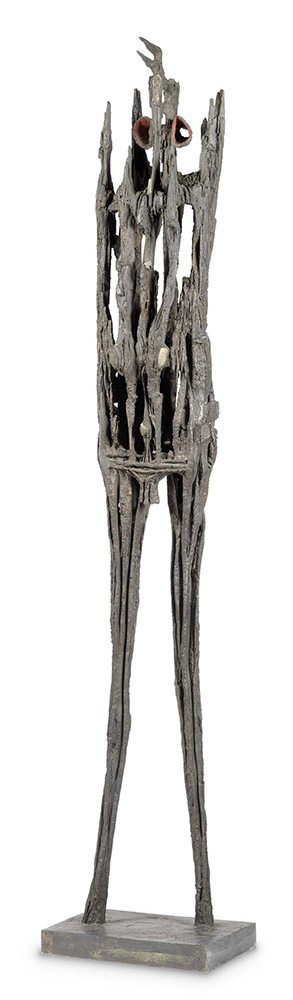 Agenore Fabbri, Barba (Pt) 1911 - Savona 1998, Personaggio atomizzato (Personaggio spaziale III - Geremia), 1958, Scultura in bronzo, es unico, cm 192 h, Firma sulla base: A Fabbri, Storia: Opera acquistata direttamente dall'artista (1988), Foto autenticata dall'artista, Esposizioni: XXX Biennale Internazionale d'Arte della città di Venezia, 1960, sala X, cat p 47, n 9 (Uomo atomizzato, 1959);, Mostra personale, Milano, Galleria del Milione, 1962;, IV Biennale Internazionale di Scultura, Carrara, 1965, cat p 73;, Scultura italiana all'aperto, a cura di Marco Valsecchi, Monza, Villa Reale, 28 marzo - 9 aprile 1969;, Agenore Fabbri, Milano, Palazzo Reale, Sala delle Cariatidi, gennaio - febbraio 1975;, Agenore Fabbri Gemälde, Informelle Arbeiten, Skulpturen, Zeichnungen Verzeichnis der Bestände VAF Foundation, Hannover, Sprengel Museum, 1992, cat p 122;, 10 anni di museo a Lissone, una collezione che cresce 2000-2010, Lissone, Galleria Civica, cat p 39;, Cronache del dopobomba, a cura di Alberto Zanchetta, Lissone, Museo d'Arte Contemporanea, 16 febbraio - 9 agosto 2013, Bibliografia: R Molinatti, La XXX Biennale di Venezia, in Telve, agosto - settembre, 1960, illustrata;, L Ferrante, Fabbri al Milione, in "Notizie", Galleria del Milione, Milano, 3 marzo, 1962, illustrata;, Silvio Riolfo Marengo, Agenore Fabbri, 1929-1988, Silvana Editoriale, Cinisello Balsamo, 1988, p 74;, Erich Steingräber, Agenore Fabbri Plastik und Malerei, Hirmer Verlag, München, 1988, p 325;, Volker Feierabend, Agenore Fabbri Catalogo ragionato, vol I, Scultura, Silvana Editoriale, Cinisello Balsamo, 2011, p 318, n S59-13;, Boom 60! Era arte moderna, a cura di Mariella Milan e Desdemona Ventroni, Electa, Milano, 2016, p 109