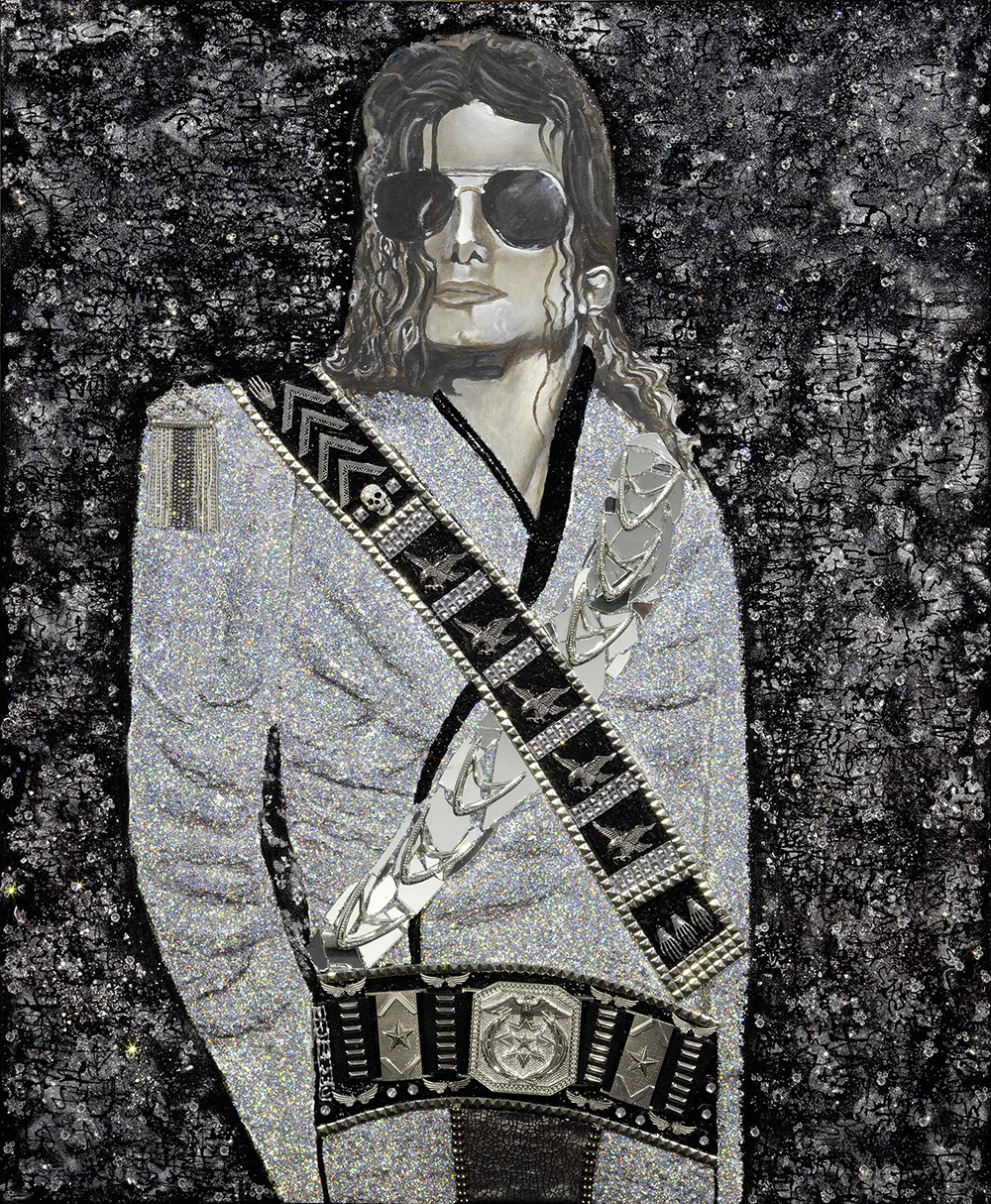 Dminc, Losanna 1964, The King, 2016, Tecnica mista, metallo, pelle e cristalli Swarovski su tela, cm 120x100, Firma e titolo al verso sul telaio: Dminc / The King, Foto autenticata dall'artista su certificato Archivio delle Opere di Dminc, Milano, con n DM 00183-010-16