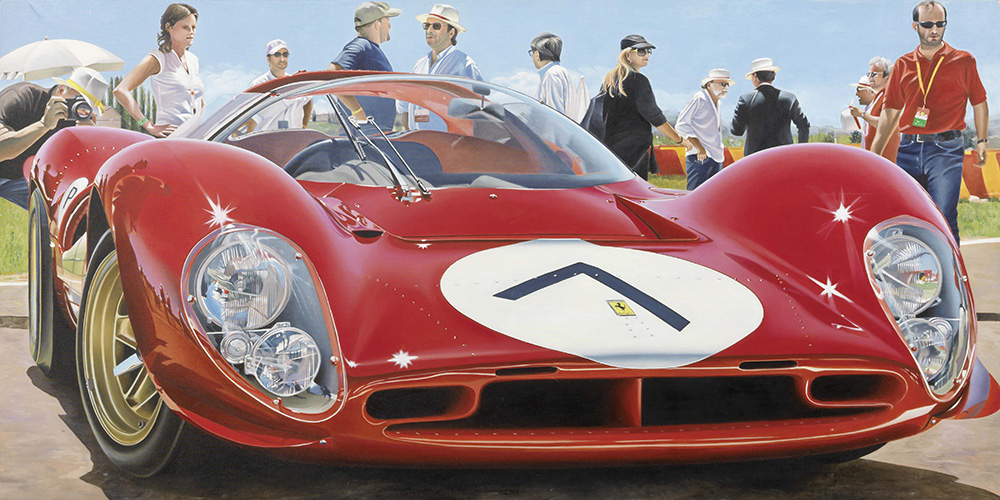 Enrico Ghinato, Lendinara (Ro) 1955, 330 P 4 Ferrari 60 Relay, 2008, Olio su tela, cm 120x240, Titolo, firma, data e numero d'archivio al verso sulla tela: 330 / P 4 - Ferrari Go Relay / Enrico Ghinato / 2008 / Arch 227; firma e data sul telaio: Enrico Ghinato marzo 2008: timbro Galleria Ferrari, Foto autenticata dall'artista in data aprile 2008, su certificato Contini Galleria d'Arte, con n 227/EG