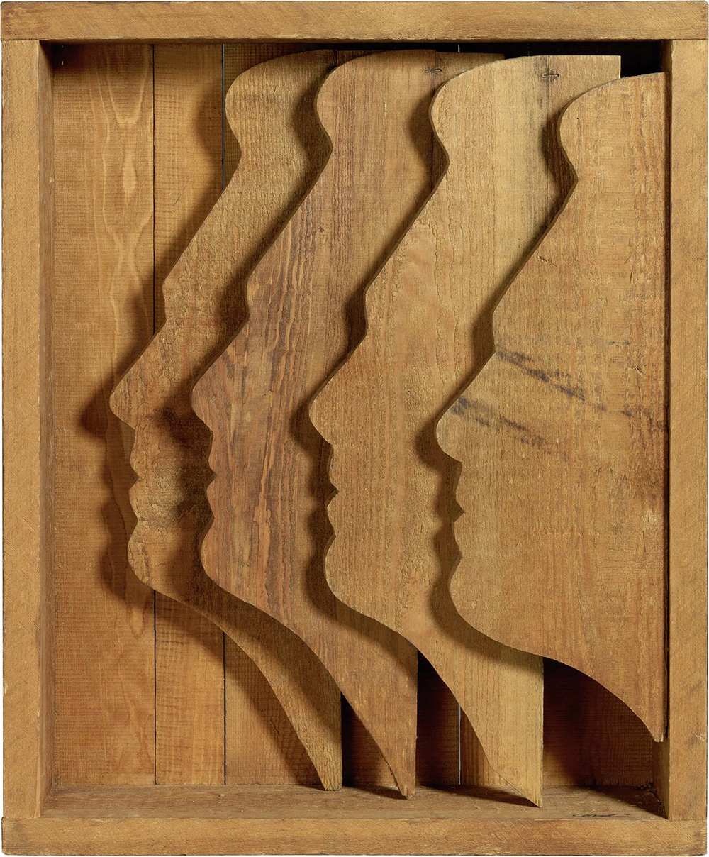 Mario Ceroli, Castelfrentano (Ch) 1938, Profili, Scultura in legno, cm 60x50x13, Firma in basso a destra: Ceroli, Foto autenticata dall'artista