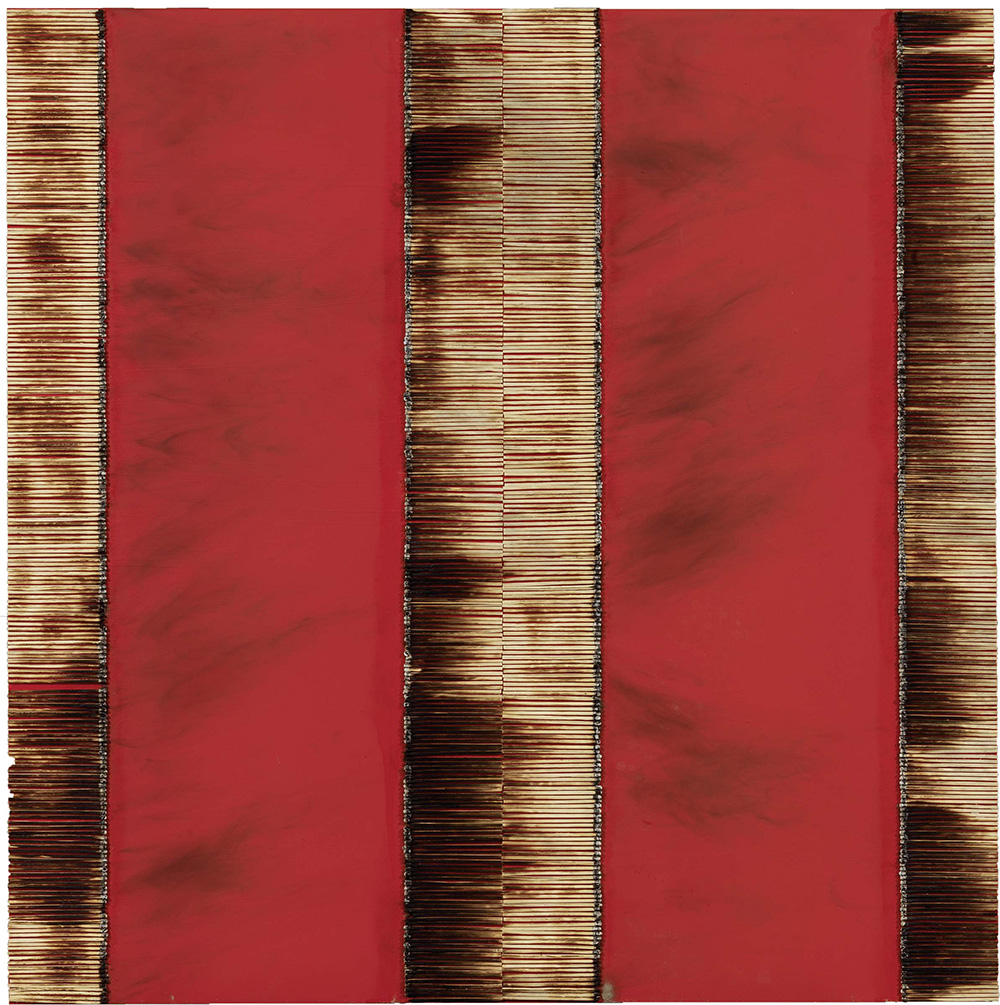 Bernard Aubertin, Fontenay-aux-Roses 1934, Dessin de Feu sur table rouge, 2006, Fiammiferi bruciati su tavola, cm 100x100, Firma e data al verso: Bernard Aubertin 2006: etichetta Civico Museo Parisi - Valle / Maccagno (Varese) / Bernard Aubertin / Territori di fuoco / 15 Maggio - 31 Luglio 2011, Esposizioni: Bernard Aubertin Territori di fuoco, Maccagno, Civico Museo Parisi - Valle, 15 maggio - 31 luglio 2011, cat p 90, illustrato a colori