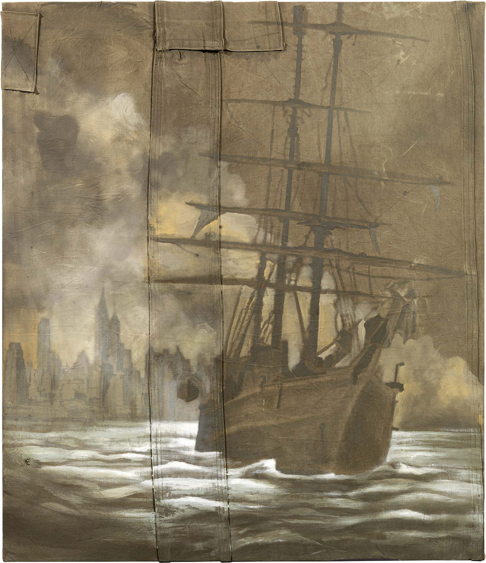 Luca Pignatelli, Milano 1962, Acque morte, 2001, Olio su telone di copertura di vagone ferroviario, cm 172x146,5, Firma, data, titolo e dedica al verso sul telone: Luca Pignatelli / Milano 2001 / "Acque morte" / A [] / Luca Pignatelli / Milano 2 X 2001, Bibliografia: Herman Melville, Moby Dick o La balena, I Classici classici Frassinelli, Milano, 2001, copertina