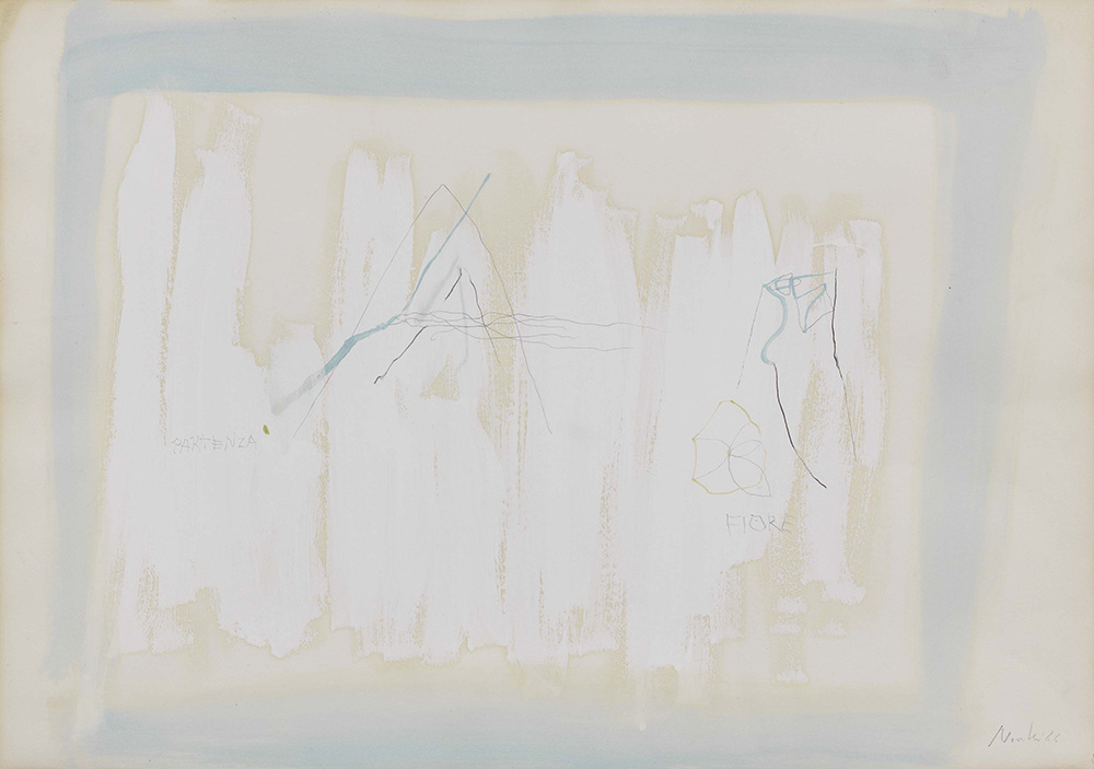 Gastone Novelli, Vienna 1925 - Milano 1968, Partenza fiore, 1966, Tecnica mista su carta, cm 50x71, Firma e data in basso a destra: Novelli 66 Al verso, su un cartone di supporto: etichetta Marlborough Galleria d'Arte, Roma, con n 1303: timbro Galleria Il Sole, Bolzano: timbro Galleria d'Arte Moderna 3A, Torino: timbro Galleria d'Arte Moderna "Bologna 2", Bologna, Certificato su foto Archivio Gastone Novelli, Roma, settembre 2016, con n 3556616C5071