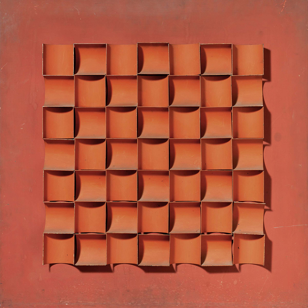 Ivan Picelj, Okucani 1924 - Zagabria 2011, Ammion, 1965, Metallo dipinto su tavola, cm 70x70x5, Titolo, firma e data al verso: Ammion / Picelj Ivan / 65: etichetta con firma dell'artista e dati dell'opera, Storia: Galerie 2B, Budapest; Collezione privata