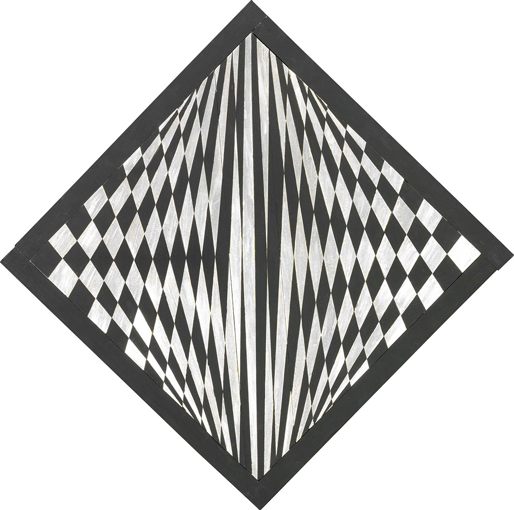 Dadamaino, Milano 1935 - 2004, Oggetto ottico dinamico, 1964, Tessere di alluminio fresato e pittura su tavola, cm 58x58 (diagonale), cm 41 (lato), Firma, titolo e data al verso: Dadamaino / Milano / Ogg - Ott / Din Ind / Progr 5/64, Certificato su foto di Flamino Gualdoni in data 6/12/09, opera registrata presso l'Archivio Dadamaino al n 252/09