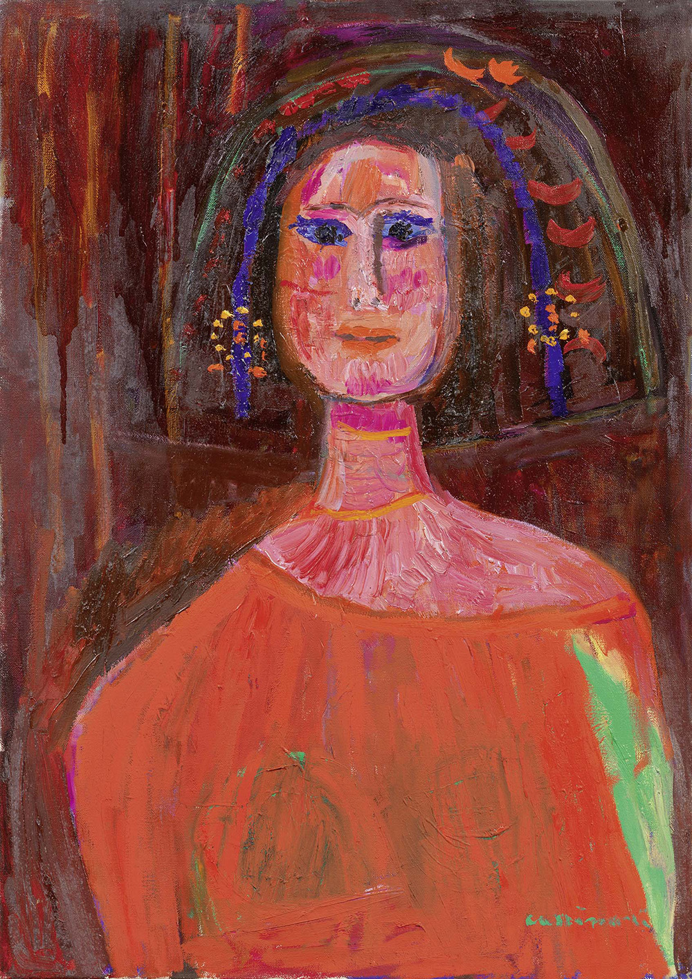 Bruno Cassinari, Piacenza 1912 - Milano 1992, Figura in rosso, 1985, Olio su tela, cm. 71x50, Firma in basso a destra: Cassinari; titolo, firma e data al verso sulla tela: "Figura in / rosso" / Cassinari / 85; sul telaio: etichetta Collezione / Carlo Introvigne / Torino., Certificato su foto Finarte, Roma, 12/11/1994, con n. 1093/R