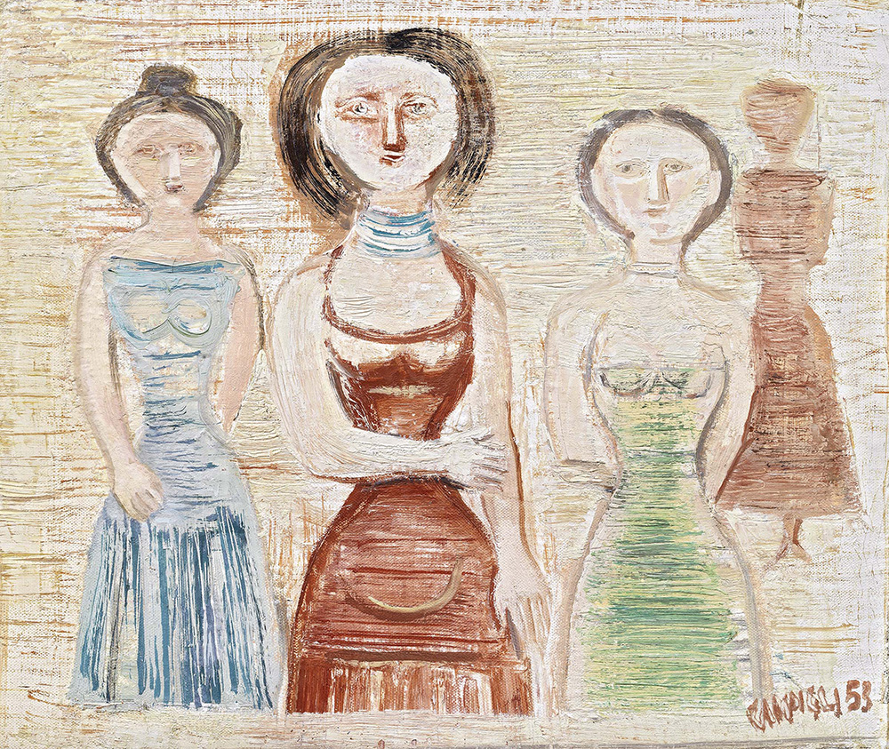 Massimo Campigli, Berlino 1895 - St.Tropez 1971, Figure, 1953, Olio su tela, cm. 31x36,5, Firma e data in basso a destra: Campigli 53. Al verso, sulla tela e sul telaio: tre timbri Galleria d'Arte "Molino", Roma., Storia, Galleria d'Arte "Molino", Roma;, Galleria d'Arte S. Mercuriale, Forlì;, Collezione privata, Foto autenticata dall'artista, Roma, 10-7-70, con timbro Galleria d'Arte S. Mercuriale, Forlì, e timbro Galleria d'Arte "Molino", Roma., Bibliografia, Nicola Campigli, Eva Weiss, Marcus Weiss, Campigli, catalogue raisonné, vol. II, Silvana Editoriale, Milano, 2013, p. 655, n. 53-077