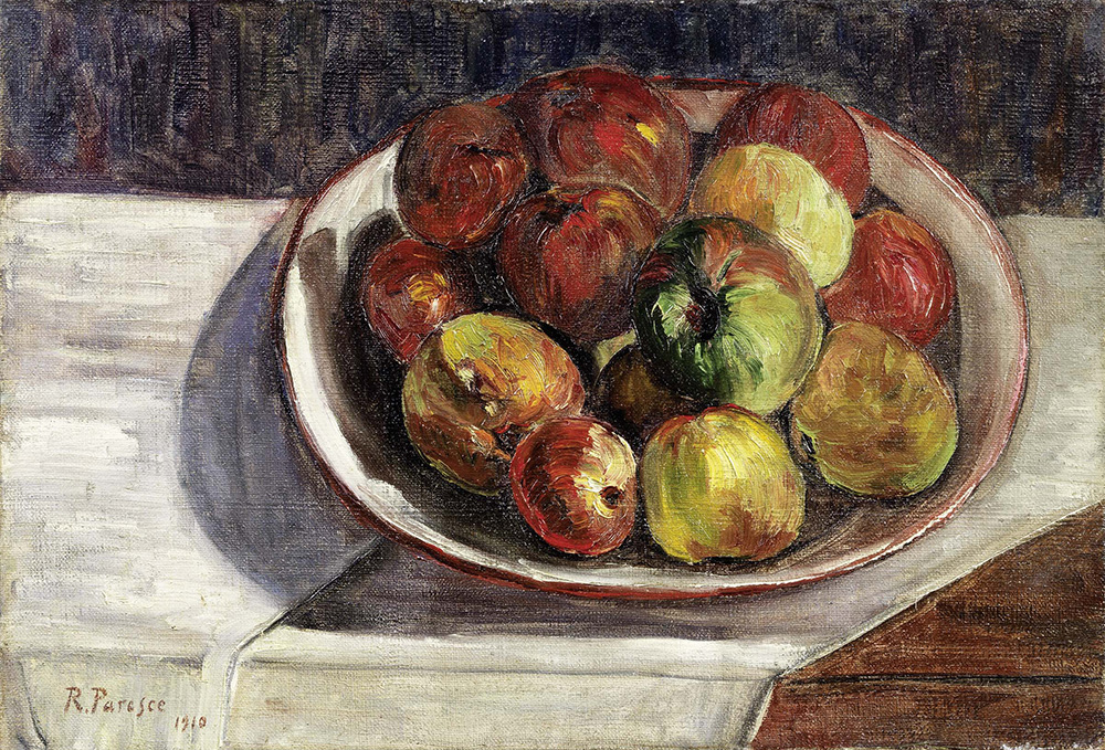 René Paresce, Carouge 1886 - Parigi 1937, Natura morta, 1910, Olio su tela, cm. 38x55, Firma e data in basso a sinistra: R. Paresce 1910., Certificato su foto di Rachele Ferrario, con n. 5/10., Bibliografia, Rachele Ferrario, René Paresce. Catalogo ragionato delle opere, Skira editore, Milano, 2012, p. 151, n. 5/10
