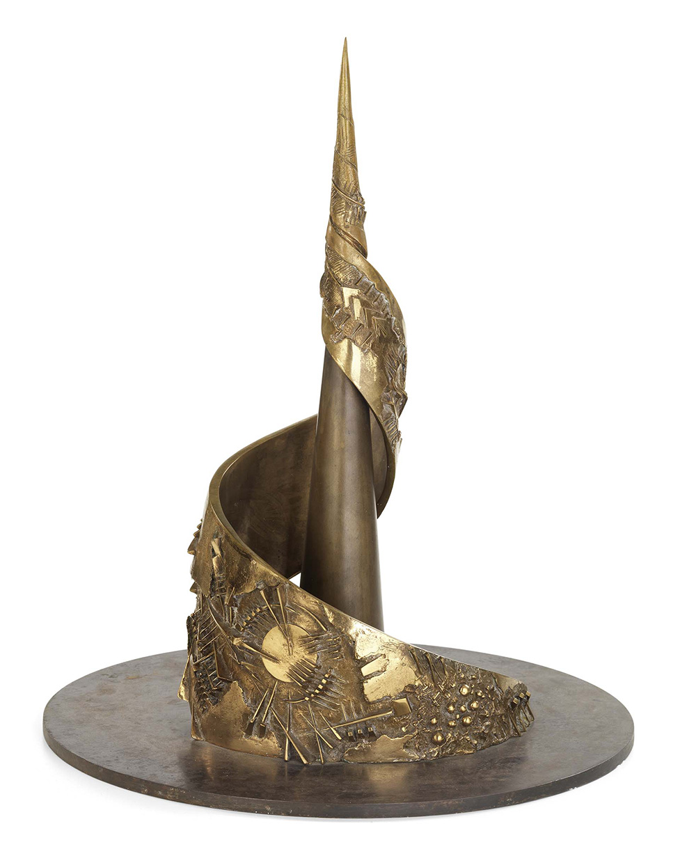 Arnaldo Pomodoro, Morciano di Romagna (Fc) 1926, Spirale aperta, 1990, Scultura in bronzo dorato, es. 1/9, cm. 53,5 h., Firma, data e tiratura sulla base: Arnaldo Pomodoro 1990 - 1/9., Foto autenticata dall'artista, Milano, Nov. 2006, con timbro a secco Fondazione Arnaldo Pomodoro e n. 642., Tiratura di 9 esemplari più una prova d'artista., Bibliografia, Flaminio Gualdoni, Arnaldo Pomodoro. Catalogo ragionato della scultura, tomo II, Skira Editore, Ginevra - Milano, 2007, p. 698, n. 869