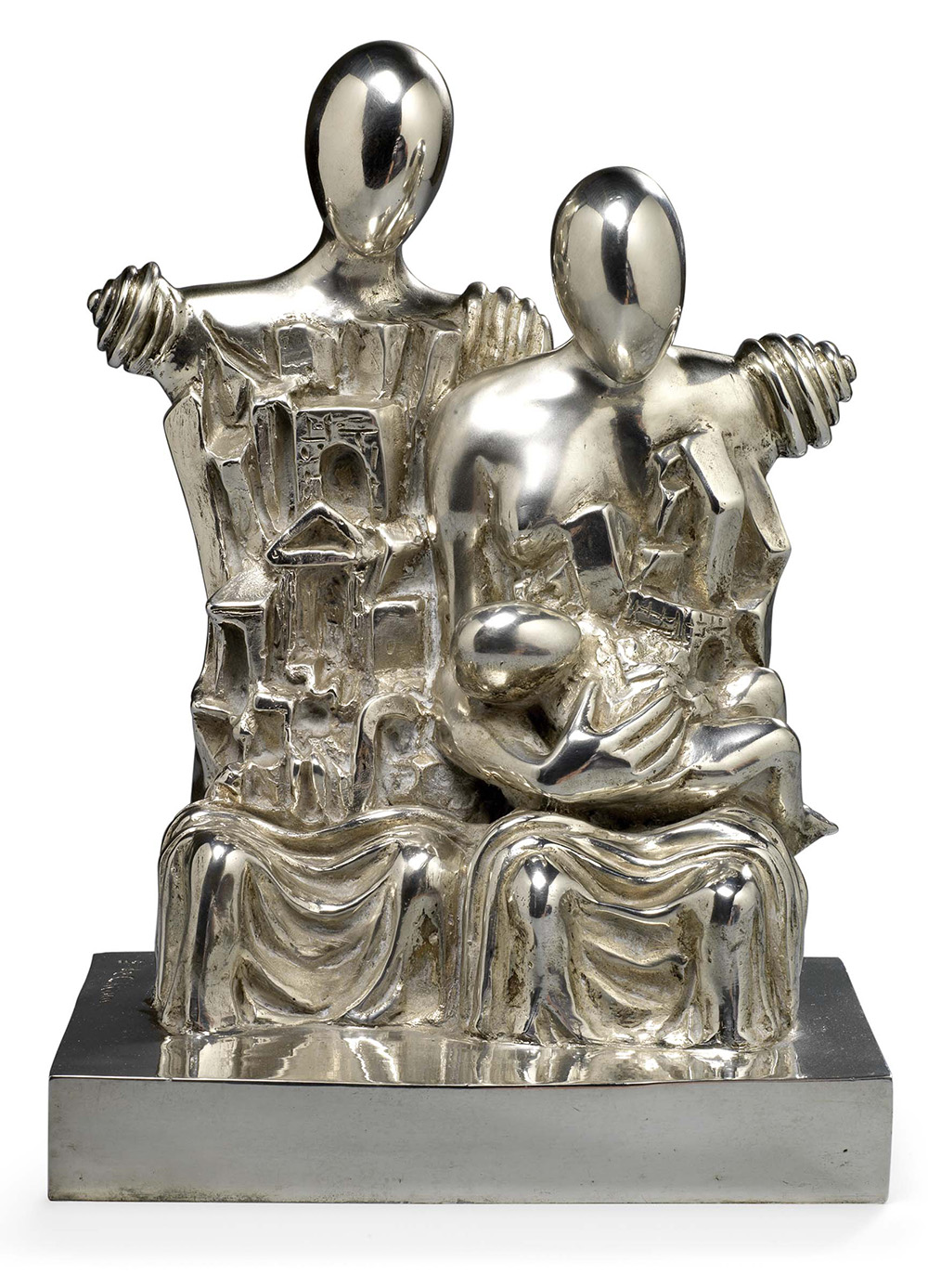 Giorgio de Chirico, Volos 1888 - Roma 1978, Archeologi con bambino, Scultura in bronzo argentato, es. V/VII, cm. 36,5 h., Firma e tiratura sulla base: G. de Chirico / V/VII: punzone Fonderia Bonvicini, Verona: marchio del Centenario della nascita del Maestro Giorgio de Chirico., Certificato su foto di Claudio Bruni Sakraischik., Esposizioni, La Neometafisica. Giorgio de Chirico & Andy Warhol, Cortina d'Ampezzo, Farsettiarte, 26 dicembre 2011 - 8 gennaio 2012, poi Firenze, Galleria d'Arte Frediano Farsetti, 14 gennaio - 18 febbraio 2012, cat. n. 16, illustrata a colori;, Giorgio de Chirico. Myth and Mystery, Londra, Estorick Collection of Modern Italian Art, 15 gennaio - 19 aprile 2014, cat. pp. 64, 65, n. 20, illustrata a colori., Da un gesso originale inedito del 1969, tiratura in sette esemplari numerati da I/VII a VII/VII, due prove d'artista segnate EA I/II, EA II/II e una prova fuori commercio non numerata per la Fondazione Giorgio e Isa de Chirico., L'edizione è stata eseguita presso la Fonderia Bonvicini di Verona (1988 e 1991), in occasione del Centenario della nascita del Maestro, ed è stata autorizzata dalla signora Isabella de Chirico alla signora Lisa Sotilis, in data 27 marzo 1987., Bibliografia, Paolo Baldacci, De Chirico. The Centenary Sculptures. Le Sculture del Centenario, Allemandi, Torino, 1995, n. 10;, Achille Bonito Oliva, Giorgio De Chirico. Pinturas e esculturas, catalogo della mostra Museu Brasileiro da Escultura, San Paolo, 16 marzo - 28 aprile, Torcular, Milano, 1998, pp. 22, 72, n. 21