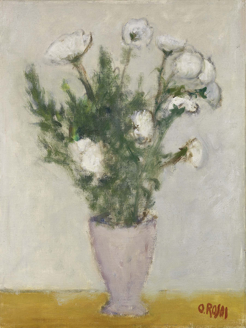 Ottone Rosai, Firenze 1895 - Ivrea (To) 1957, Fiori bianchi, Olio su tela, cm. 60,5x45,4, Firma in basso a destra: O. Rosai. Al verso sulla tela: etichetta Galleria d'Arte Farsetti, Prato, con n. 04: etichetta e tre timbri Eredità Rosai in data 31/5/57: numero 424