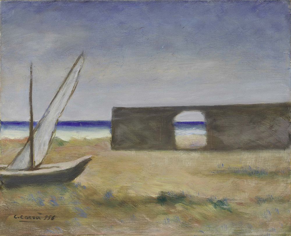 Carlo Carrà, Quargnento (Al) 1881 - Milano 1966, Arco sul mare, 1956, Olio su tela, cm. 40,3x49,8, Firma e data in basso a sinistra: C. Carrà 956. Al verso sulla tela: due timbri Galleria Annunciata, Milano, di cui uno con n. 3535., Storia, Collezione A. Sarli, Milano;, Collezione privata, Bibliografia, Massimo Carrà, Carrà, tutta l'opera pittorica volume III, 1951-1966, L'Annunciata / La Conchiglia, Milano, 1968, pp. 577, 250, n. 23/56
