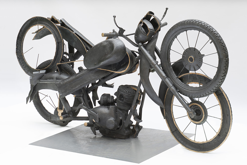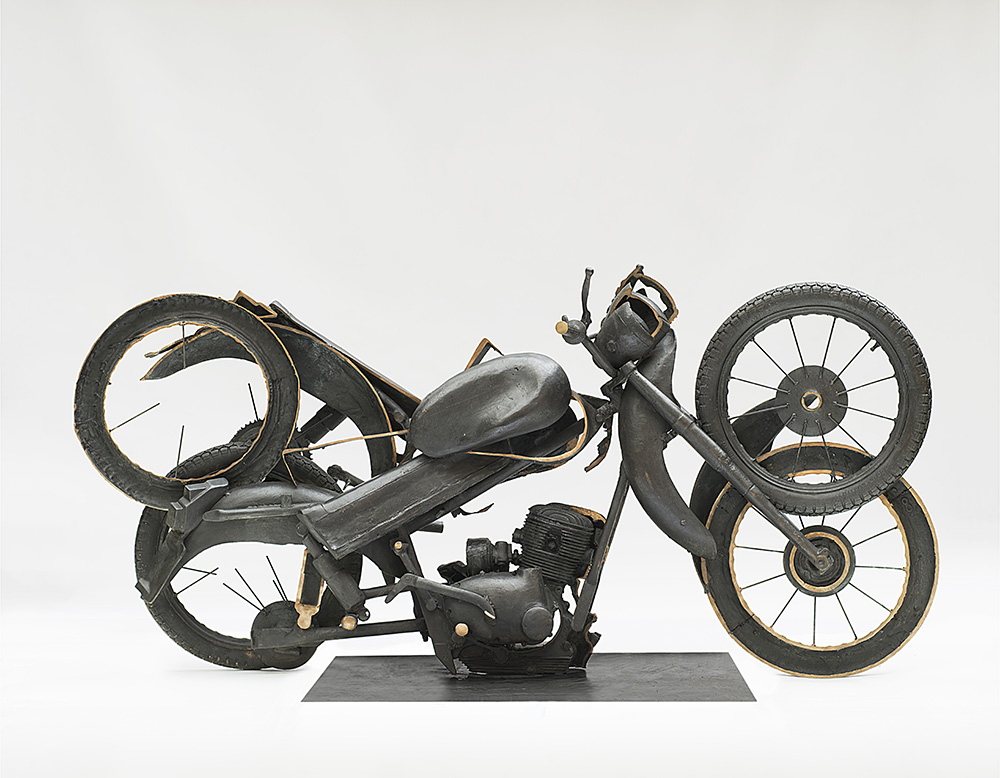 "Carousel" 1988sliced bronze motorcycle with black patina,