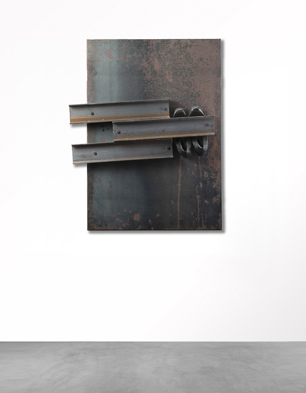 JANNIS KOUNELLIS "Senza titolo" metallo, putrelle e scarpe cm 100x80x14...