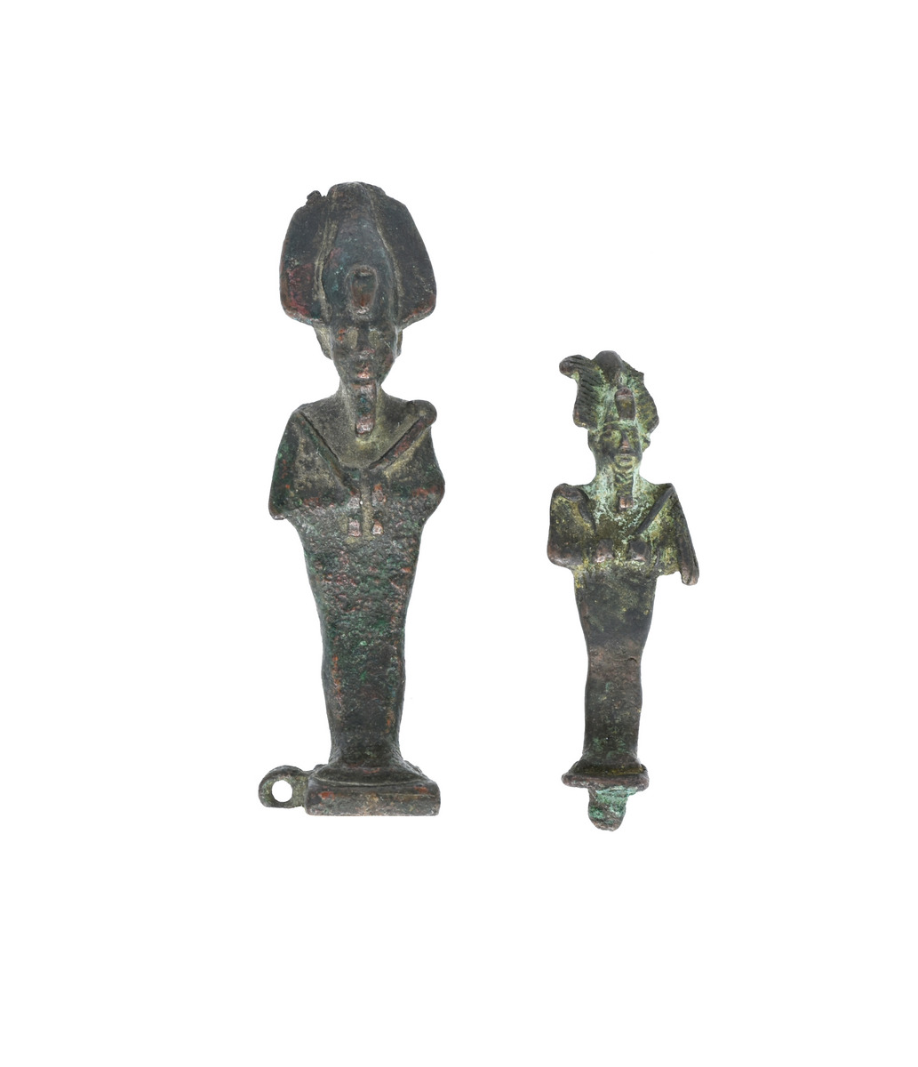 DUE STATUETTE DI OSIRIDE DATAZIONE: Epoca Tarda 716-30 a.C MATERIA E TECNICA: bronzo a fusione piena, rifinito a cesello Il dio è raffigurato stante in posizione frontale con corpo mummiforme, completamente avvolto dal mantello dal quale fuoriescono solo le mani che impugnano lo scettro ed il flagello. Sulla testa porta la caratteristica corona piumata atef sormontata dall’ureo. Il dio ha la lunga barba posticcia intrecciata, desinente a ricciolo, i particolari anatomici sono accennati sotto al mantello PRODUZIONE: cultura egiziana STATO DI CONSERVAZIONE: integri, bella patina verde scuro DIMENSIONI: alt. cm 8,5 e cm 6,5