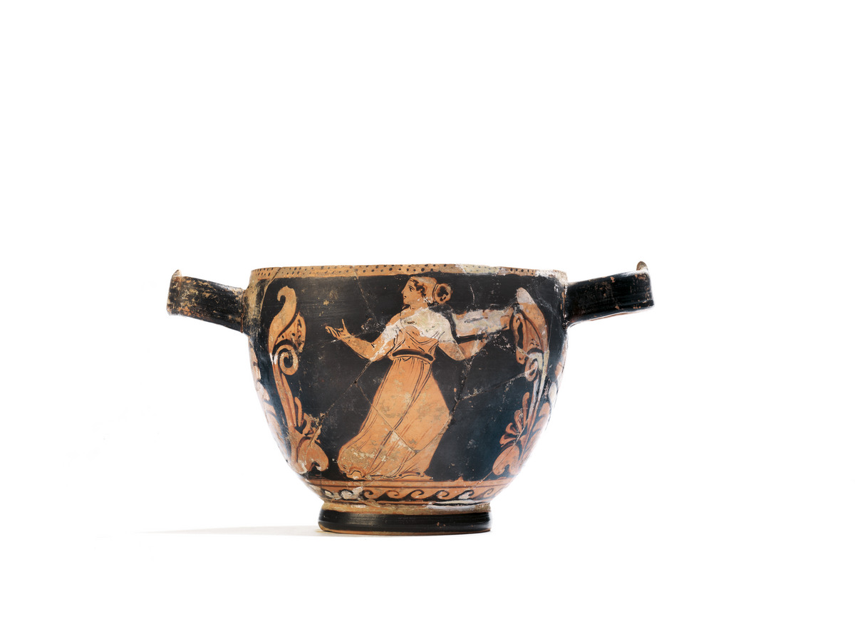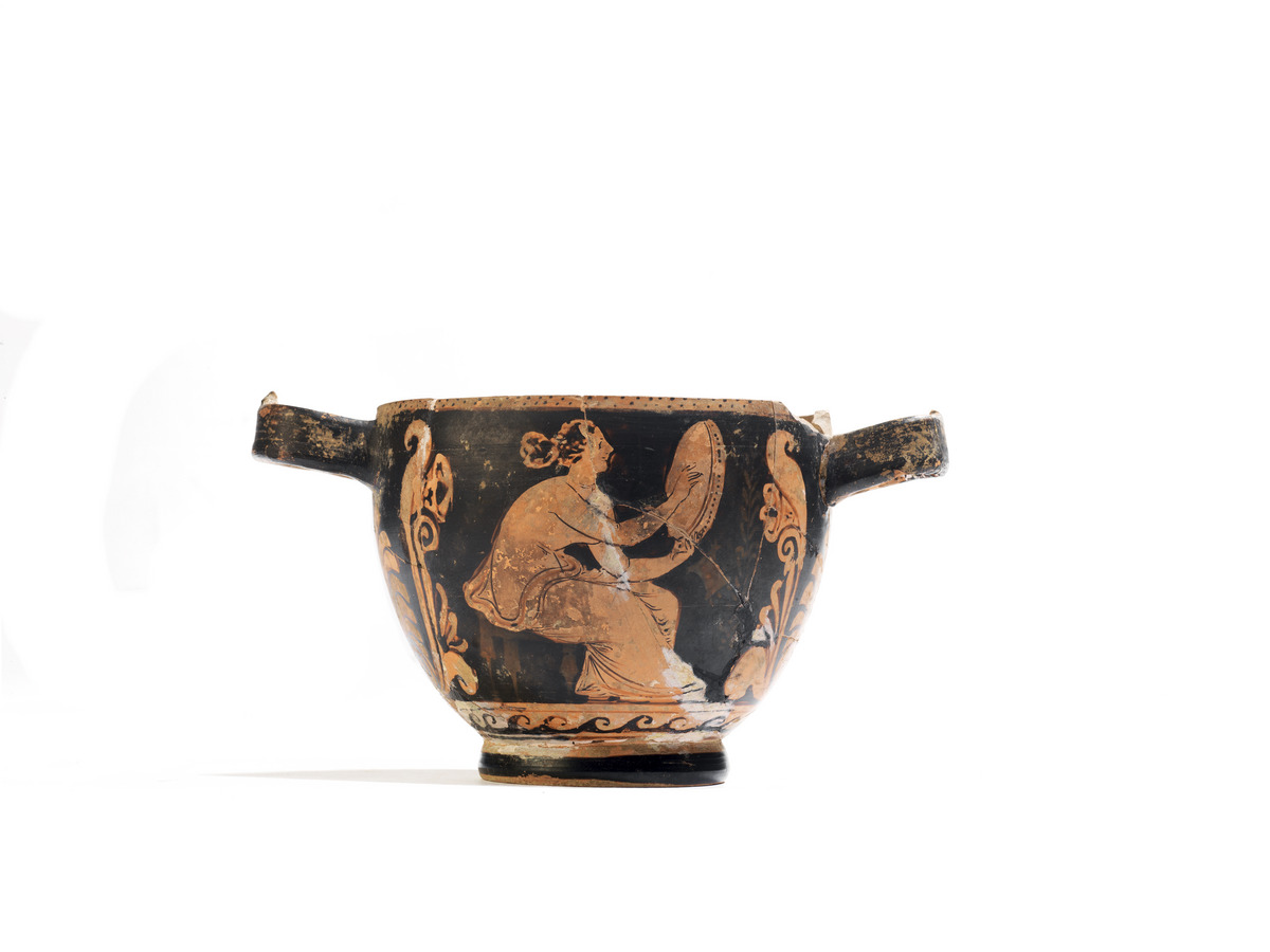 PISSIDE SKYPHOIDE SICELIOTA A FIGURE ROSSE DATAZIONE: IV sec. a.C. MATERIA E TECNICA: argilla figulina rosata; vernice nera lucente, eseguita a tornio veloce Vasca con labbro obliquo verso l’interno per l’alloggiamento del coperchio; vasca troncoconica a profilo convesso, piede ad echino modanato DECORAZIONE ACCESSORIA: vasca interamente verniciata in nero ad eccezione dell’interno delle anse, dell’attacco col piede e della parte inferiore del piede; sul bordo fascia risparmiata con decorazione a puntini, sotto le anse grande palmetta aperta fra volute e infiorescenze, alla base della scena figurata meandro ad onda DECORAZIONE: lato A: figura femminile seduta a sinistra sopra uno sgabello con i capelli raccolti in una crocchia sulla nuca e fermati da una tenia; la donna, a torso nudo, è in atto di suonare un cembalo ed indossa un mantello drappeggiato intorno alla vita e alle gambe, di fronte a lei un arbusto ed una situla; lato B: giovane donna gradiente a sinistra e retrospiciente, con le braccia sollevate ed una cista nella mano sinistra; la donna ha i cappelli raccolti in una crocchia ed indossa un chitone plissettato fermato in vita da una fascia le cui pieghe si aprono seguendo il movimento PRODUZIONE: Sicilia, Gruppo di Lentini STATO DI CONSERVAZIONE: ricomposta da frammenti con piccole integrazioni DIMENSIONI: alt. cm 11; diam. cm 13 CFR.: A. D.Trendall Red Figure Vases of South Italy and Sicily, London, 1989, p.235.